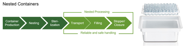 Outsourcing the prep/washing/sterilization/depyrogenation to qualified vendors who specialize in those operations allow the CMO to focus on their strengths. The nested format also makes batch traceability and segregation simpler.