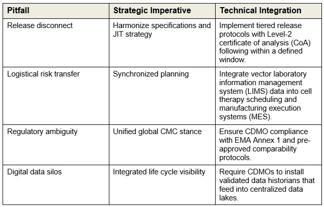 The incapability to stock viral vectors elevates their role from a supply component to a strategic interface. By resolving the four core challenges — release disconnect, logistical risk transfer, regulatory ambiguity, and digital data silos — sponsors can transform a fragmented supply chain into a scalable capability.