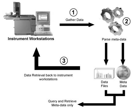 Figure 1 - Typical workflow for archiving analytical data. Note, the meta-data can be queried but the analytical data cannot be generally accessed except by the original instrument workstation.