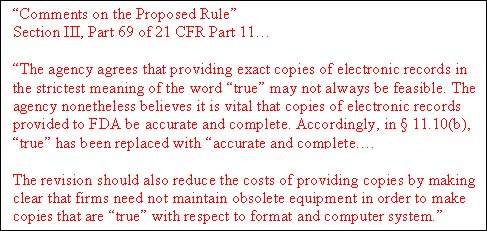 In its comments on 21 CFR Part 11, the FDA recognized the financial burden that could be placed on companies if it forced them to maintain obsolete instrument and computer equipment in order to maintain records that are ‘true' (see panel below). The conversion of data files into a standard, normalized format appears to have regulatory support.