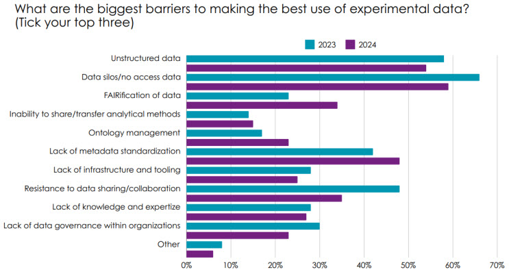 Underpinning the successful use of any new technology, including AI and machine learning, is putting in place a strong data backbone. One change since the 2023 survey is observed in the barriers to utilizing experimental data. Last year, cultural resistance to data sharing was cited by 48% of respondents, but in 2024 that’s down to 35%. This suggests companies are more open to pre-competitive collaboration, as organizations increasingly realize the value of sharing expertise on areas like best practices for adopting new technologies — which has a huge cost and time benefit.