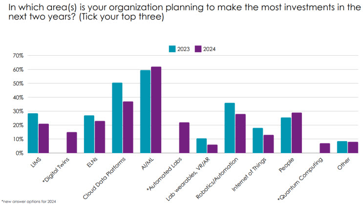It wouldn’t be a 2024 survey without a focus on AI, which 68% of respondents now say they are using in their laboratory work. This finding is up by 14% compared to last year. AI’s momentum is likely to continue, with the survey finding AI and machine learning (ML) are cited as the top tech investments organizations plan to make over the next two years (62%). In comparison, companies are focusing less on infrastructure investments such as cloud platforms (37%), electronic lab notebooks (ELNs) (23%), and laboratory information management systems (LIMS) (20%) (refer to Figure 1). This is because many labs already have some form of these technologies in place, so the focus has now shifted onto other technologies such as AI. Investment in people is also higher in 2024 compared to 2023, as companies seek to hire experts who can help them get the most out of their technology investments, and upskill current staff.