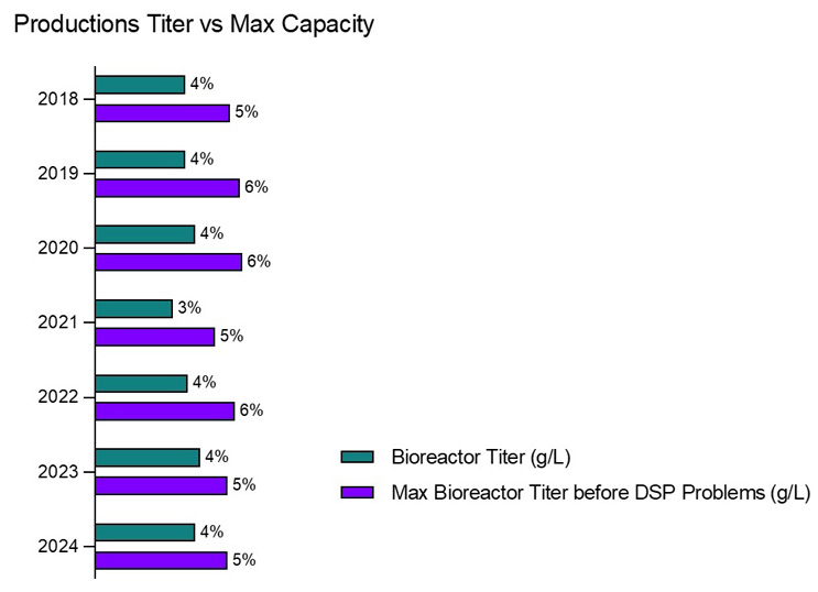 The leveling of average titers at around 4.0 g/L and the consistent DSP capacity ceiling of 5.3 g/L suggests that many biomanufacturers are finding a better balance between upstream yield improvements and downstream processing performance. The decrease in DSP overbuild further suggests that companies are optimizing their downstream processes, relying less on excessive capacity and more on technological improvements and process efficiencies to manage increasing upstream titers.