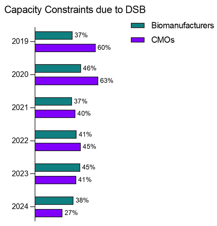 CMOs have historically faced bigger challenges in capacity caused by DSP. This is often because they must deal with multiple clients’ platforms, purification strategies, and a variety of equipment challenges. Thus, CMOs have consistently reported more severe DSP constraints compared to their biopharmaceutical manufacturing counterparts, with a six to 10 percentage point difference in responses indicating some or severe bottlenecks. This trend has persisted over the past 12 years, making downstream capacity issues a long-standing challenge for CMOs.