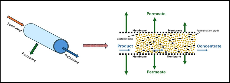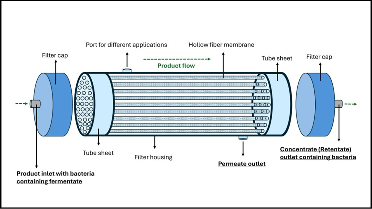 Figure 2 provides a closer look at an individual hollow fiber tube, highlighting its internal structure and the dynamics of the filtration process. The illustration shows how the fermentate enters the lumen, where fragile anaerobic cells are protected by the smooth geometry and low-shear environment. As the process continues, liquid is forced through the semi-permeable membrane wall, leaving concentrated cells inside the lumen while allowing unwanted components to be removed with minimal disturbance to cell integrity.