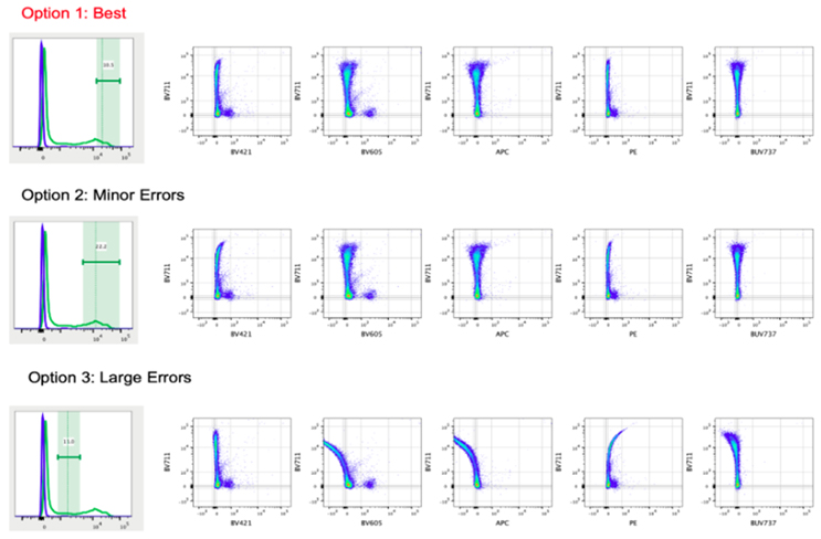 Figure 1: Gate placement has a dramatic effect on the compensation matrix generated. The same FCS file is used throughout this figure, but the compensation matrix has been varied across the three options. Option 1 has the best compensation matrix applied; it was generated by ensuring the gate placement only included the brightest positive event ensuring the dimmest shoulder of the peak was excluded. The matrix shown in option two shows some minor errors and was generate by gating the whole positive peak thus including the "dimly" positive shoulder region events. In the third option large errors (both overcompensation and undercompensation) can be seen in the plots. The matrix was generated incorrectly gating the region between the positive and negative populations. Figure adapted with permission from https://voices.uchicago.edu/ucflow/2020/06/24/the-right-and-wrong-way-to-set-up-automated-compensation-tools-how-to-achieve-accurate-compensation (Accessed Sept. 2024).5