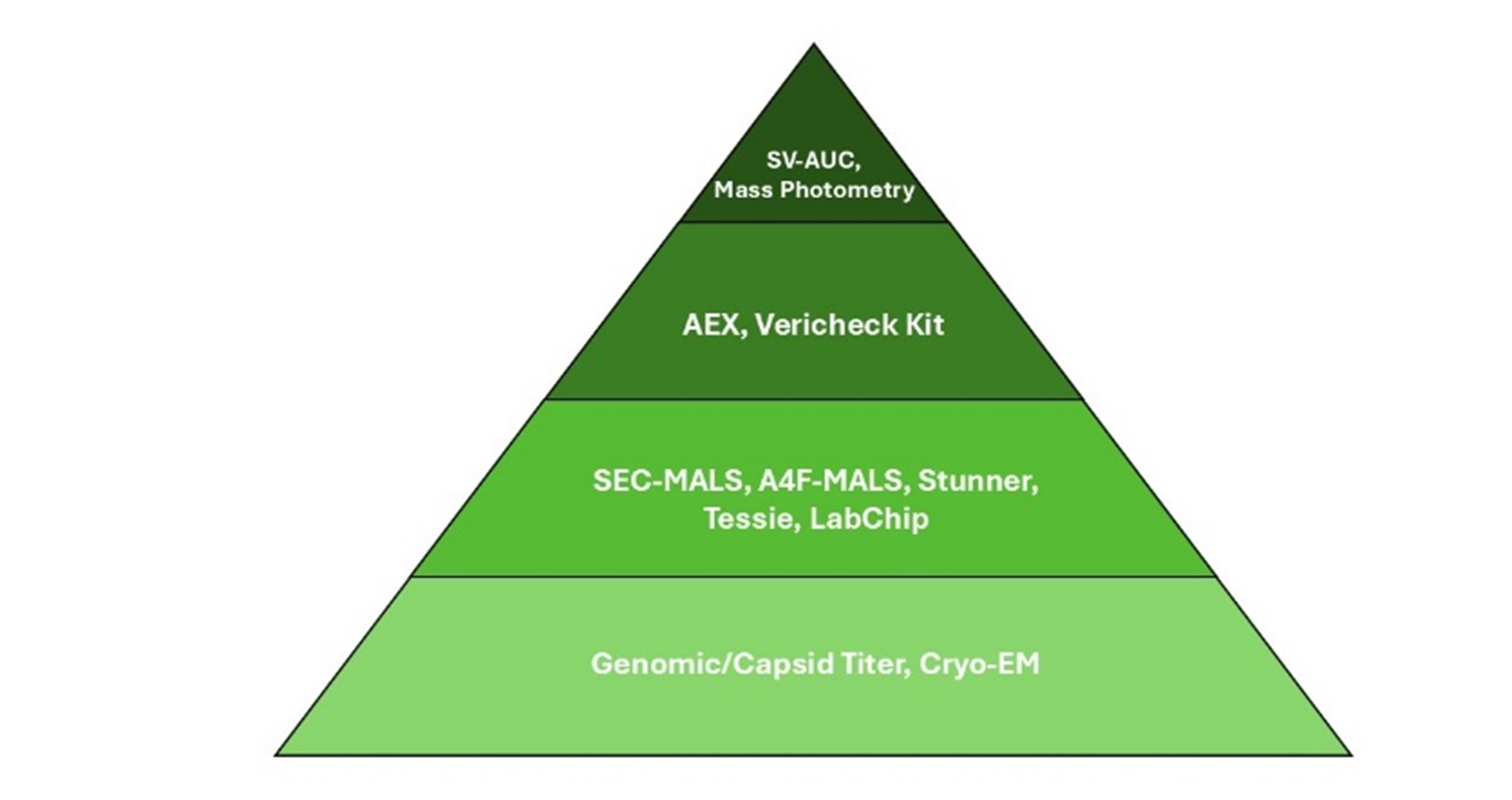 - What type of sensitivity are you trying to achieve? In certain laboratory scenarios, accuracy is regarded as beneficial rather than essential. Analytical methods that rely on input values, relative measurements, or ratios such as the cargo DNA to capsid ratio for determining percent full can be utilized. For more sensitive applications, methods like Tessie, Stunner, and commercially available kits are suitable. For extremely sensitive requirements, advanced methods such as SV-AUC, MP, SEC, and AF4 MALS are recommended.