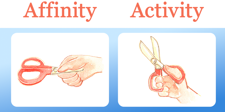 Just because an antibody binds tightly to the target, doesn’t necessarily mean it’s bound in the right place. He uses a scissor analogy to explain this concept (illustrated below). You can hold scissors tightly by the blades, which symbolizes a high-affinity interaction, but that doesn’t help you cut anything. However, if you hold them loosely and in just the right places, you can cut away to your heart’s content.