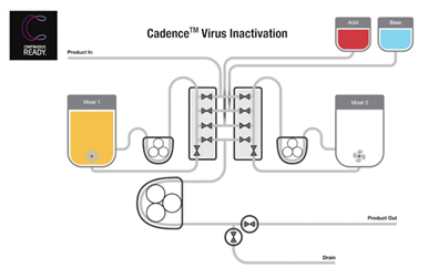 Figure 2 below shows the flow path of the stirred tank system. Acid is added to achieve the inactivation pH. When it is reached, a 1-hour time is set. At the 1-hour point, base is added to neutralize the material in mixer one, and the pH is raised for the next process step. When the desired pH is reached, mixer one is emptied, and the material in mixer two is acidified while new material is being brought into mixer one. This is essentially a swing strategy where one tank is filling while the other tank processes and then switches over at the swing point.