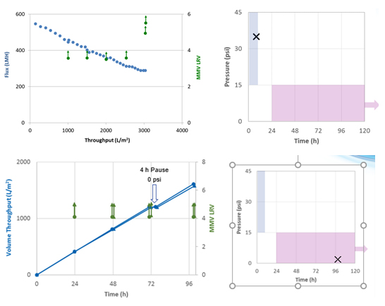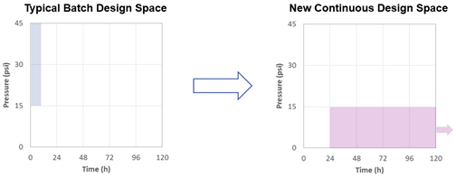 Figure 3 shows the typical batch and projected new continuous design spaces and the significant difference in operating pressure and operating time, allowing a virus filter to be run for several days at the lower, continuous flow expected during an optimal continuous process.