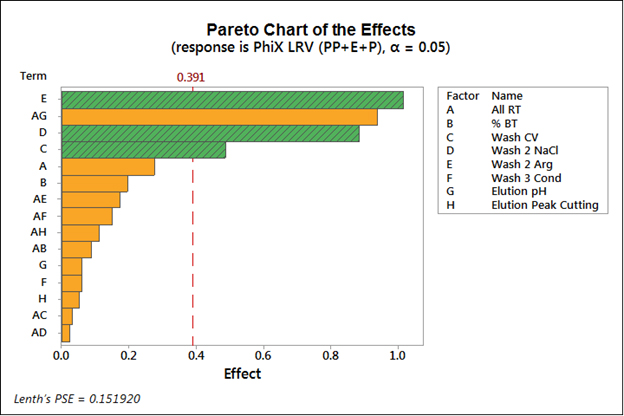 The Design of Experiments approach and subsequent Pareto chart in Figure 1 are used to identify the most important individual factors for virus clearance. Two parameters here are important for transition to continuous processing: the residence time, where there is 1 minute to mimic continuous or 4 minutes that is more typical for a batch process; and loading to percent breakthrough, where 5 percent is representative of some batch processes and loading to 60 percent breakthrough simulates what may occur in continuous processing. Neither of these factors is statistically significant, giving an initial indication that virus clearance may not be impacted by the transition to continuous processing. The results indicate three factors that have a major effect on virus clearance: the arginine in wash two, the sodium chloride in wash two, and wash CVs. These parameters are crossing to the right of the reference line for statistical significance at 95 percent confidence.